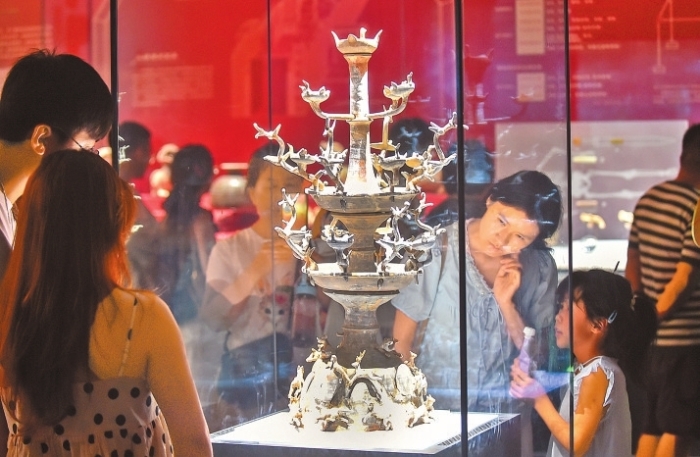 在洛阳市汉魏洛阳故城遗址博物馆,家长带着小朋友参观欣赏“东汉陶百花灯”展品。 黄政伟 摄